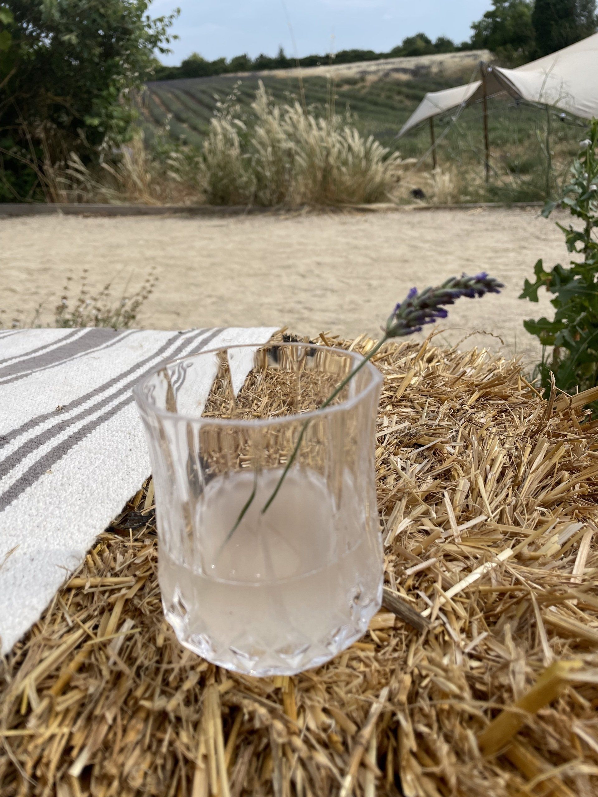 Apéritif au couché de soleil dans la lavande (Bouteille de rosée, toast, tapenade, ...)